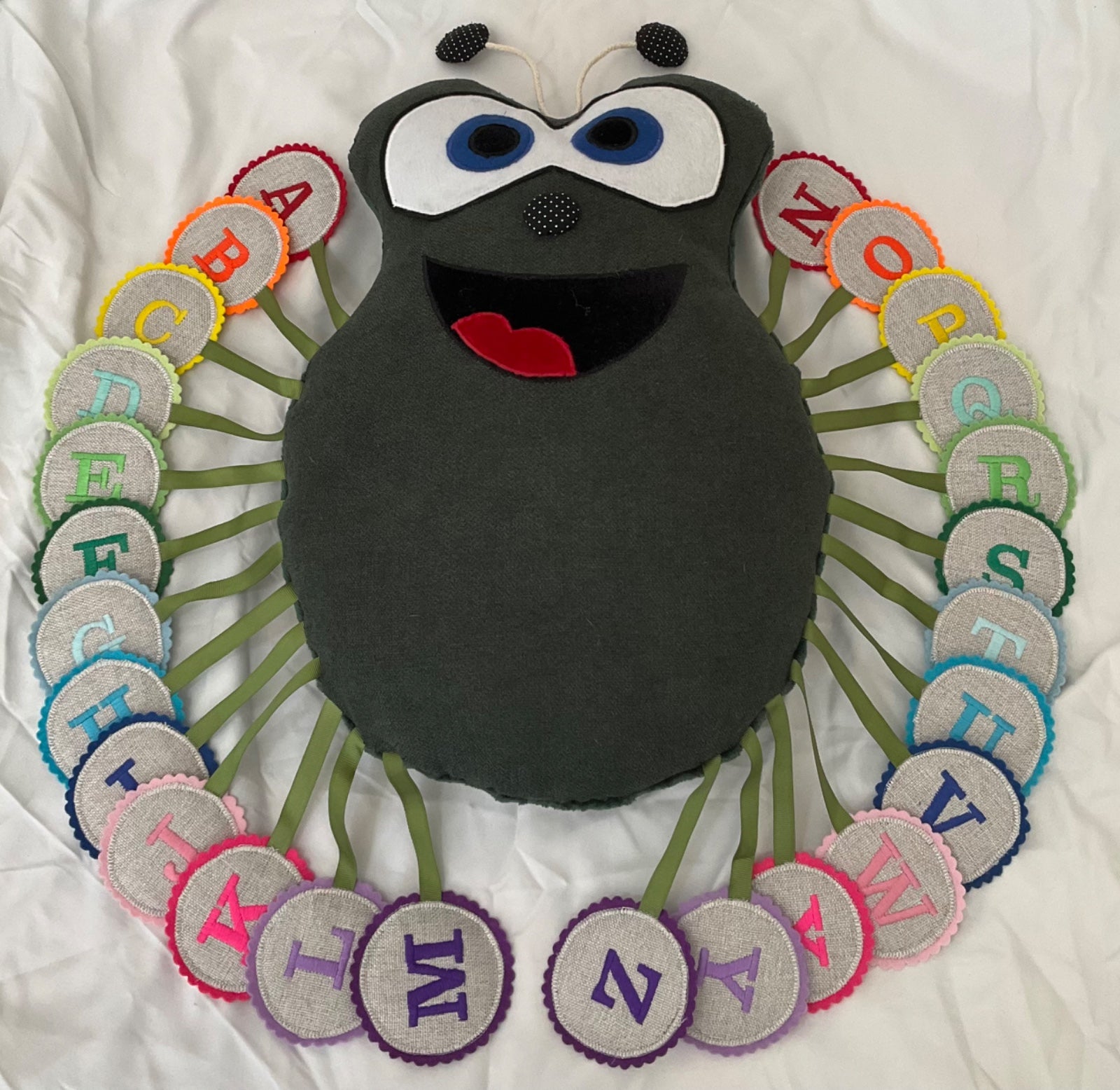 Seu corpo é feito em plush hipoalergênico, macio e seguro para todas as idades, combinado com detalhes em linho bordado à máquina que valorizam o toque e a estética artesanal. O destaque fica por conta das 26 perninhas com letras do A ao Z, bordadas individualmente, em cores vibrantes e contrastantes para atrair a atenção dos pequenos.