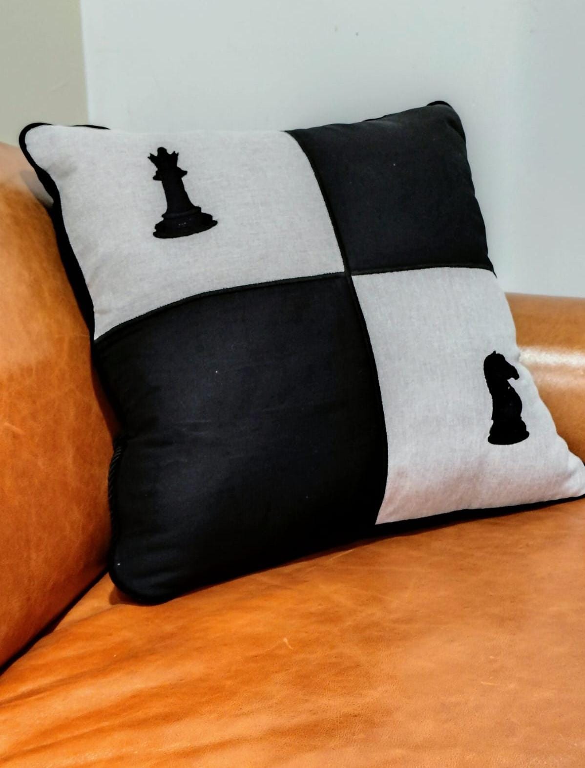 Os bordados com peças do jogo – como a rainha e o cavalo – conferem identidade e estilo a essa peça que homenageia o universo dos jogos clássicos. Ideal para ambientes que valorizam o design autoral e o toque contemporâneo.